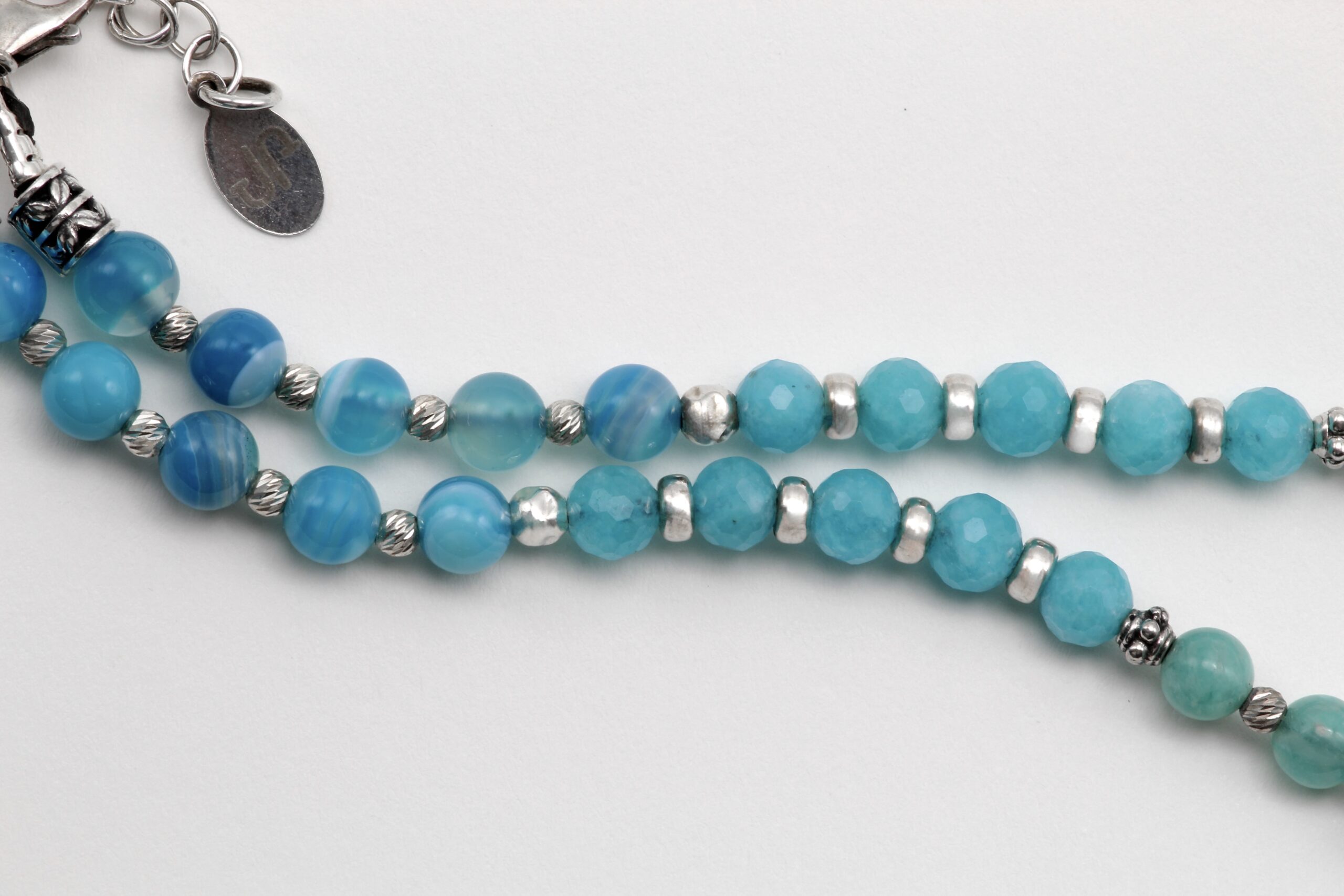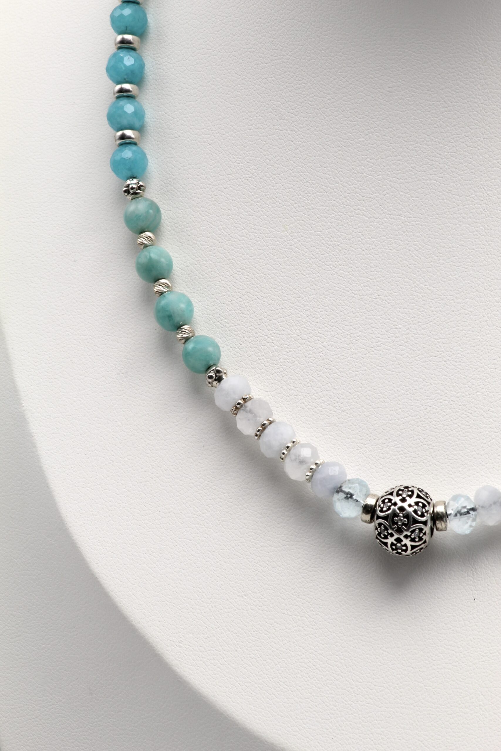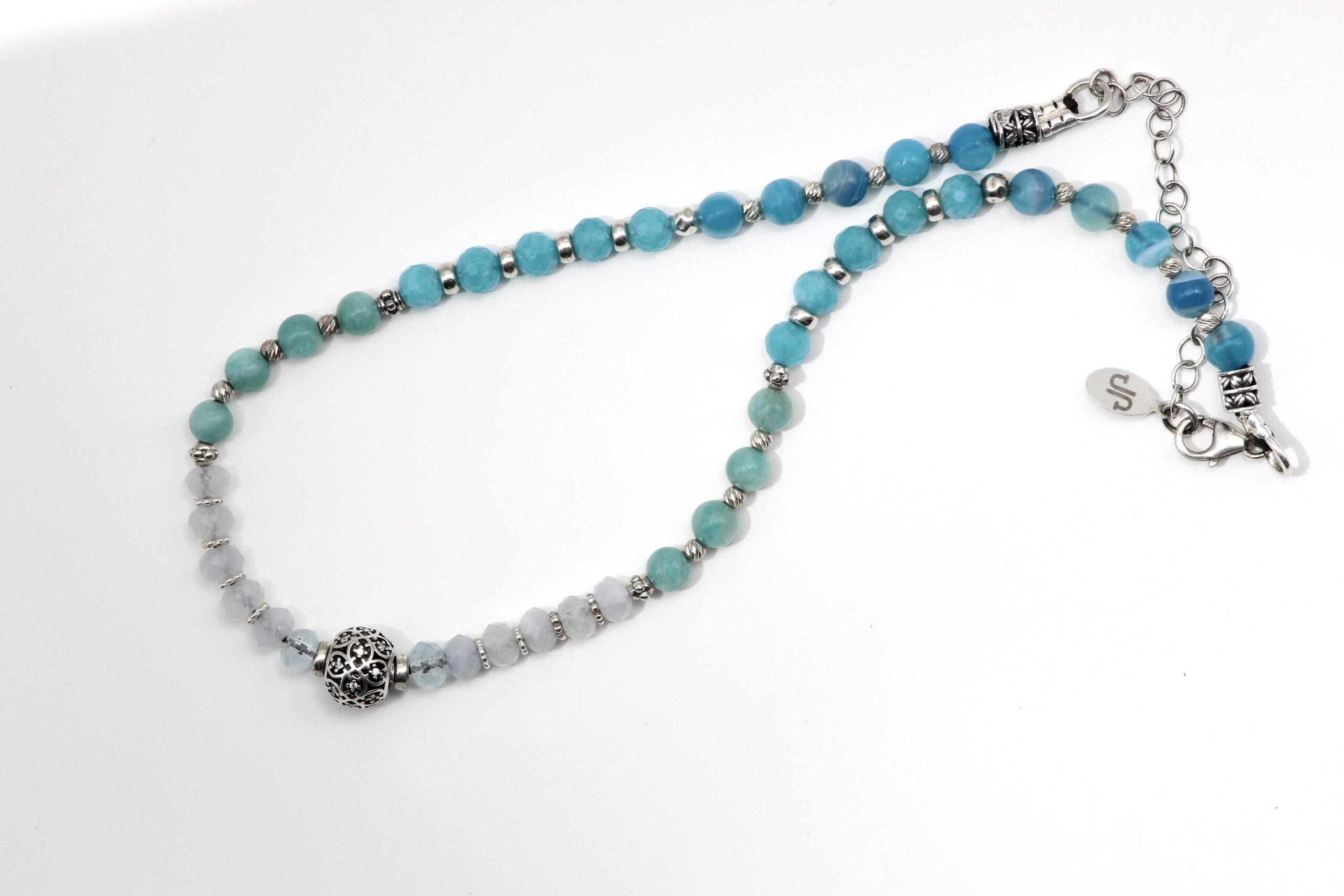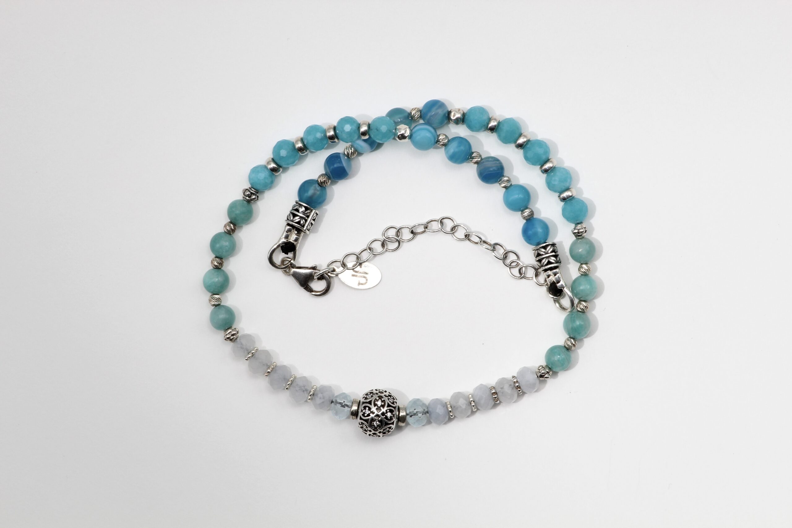 • השרשרת מעוצבת עם אבני חן מטופלות בלבד, שמביאות עימן פיסות של צבעים מרהיבים ותחושה של חיבור לטבע. השילוב המיוחד בין האגת הצבוע לאמזונייט, אקווה מרין וטופז יוצר מראה עדין ומודרני.