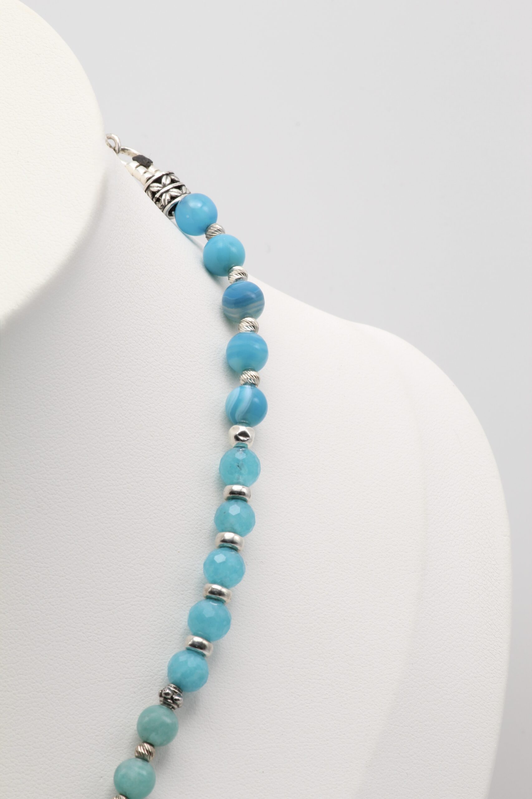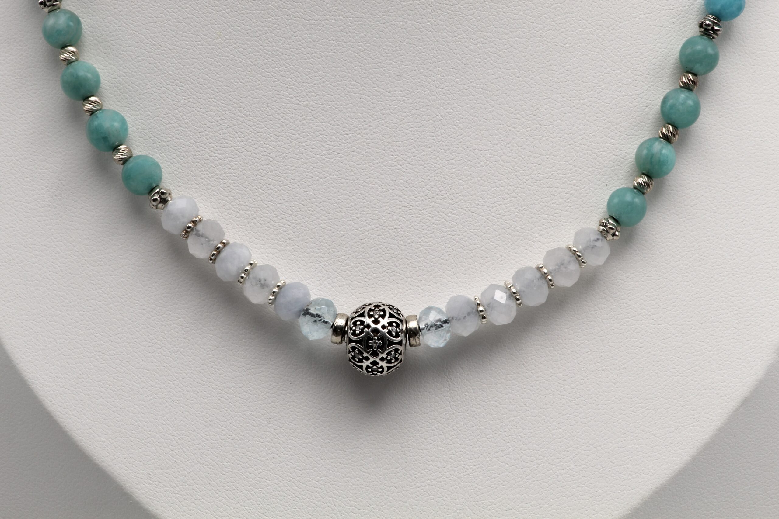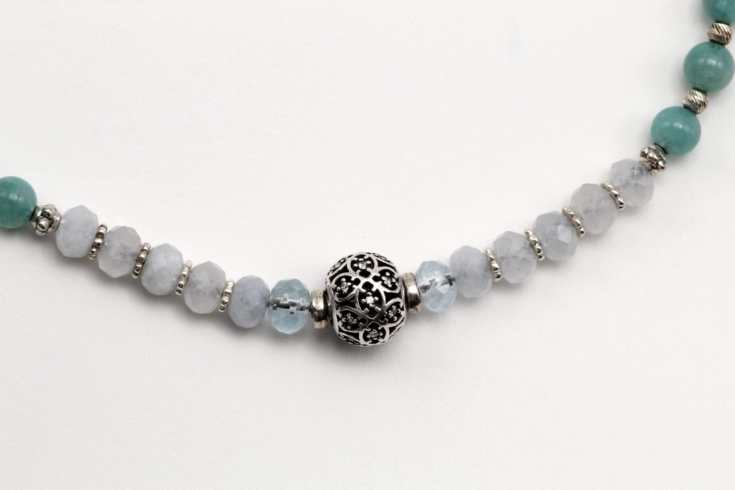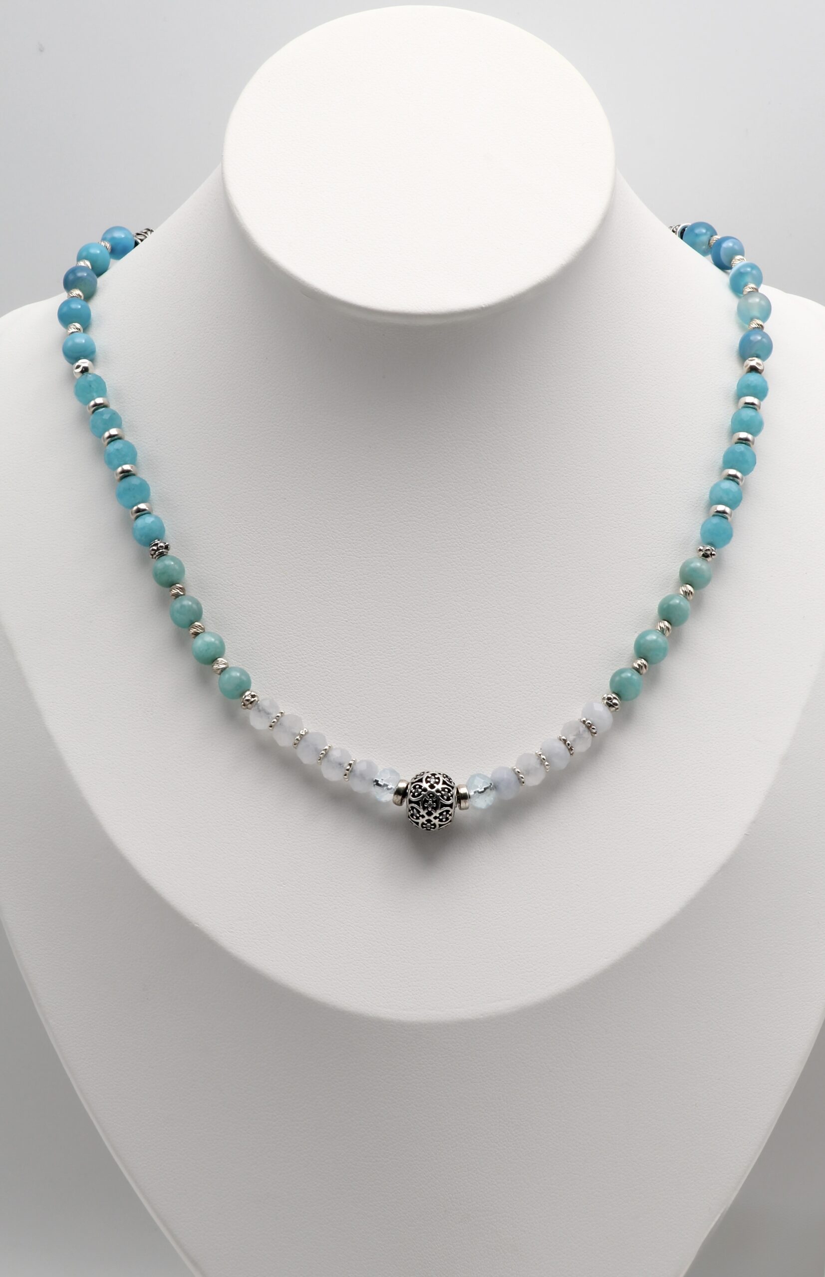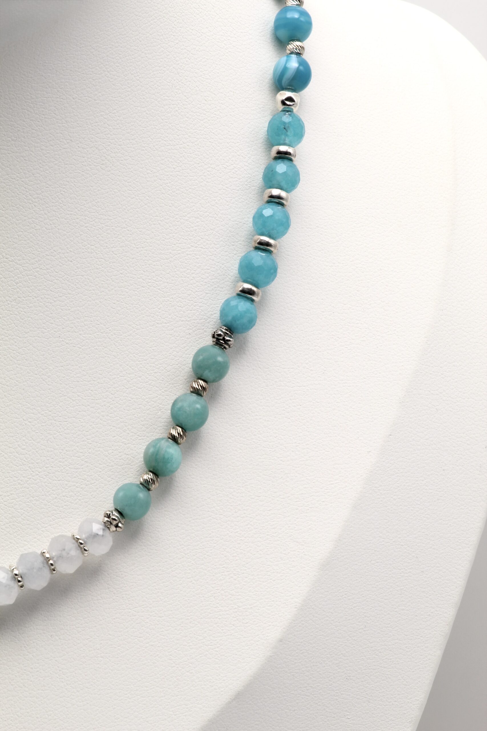 • השרשרת מעוצבת עם אבני חן מטופלות בלבד, שמביאות עימן פיסות של צבעים מרהיבים ותחושה של חיבור לטבע. השילוב המיוחד בין האגת הצבוע לאמזונייט, אקווה מרין וטופז יוצר מראה עדין ומודרני.