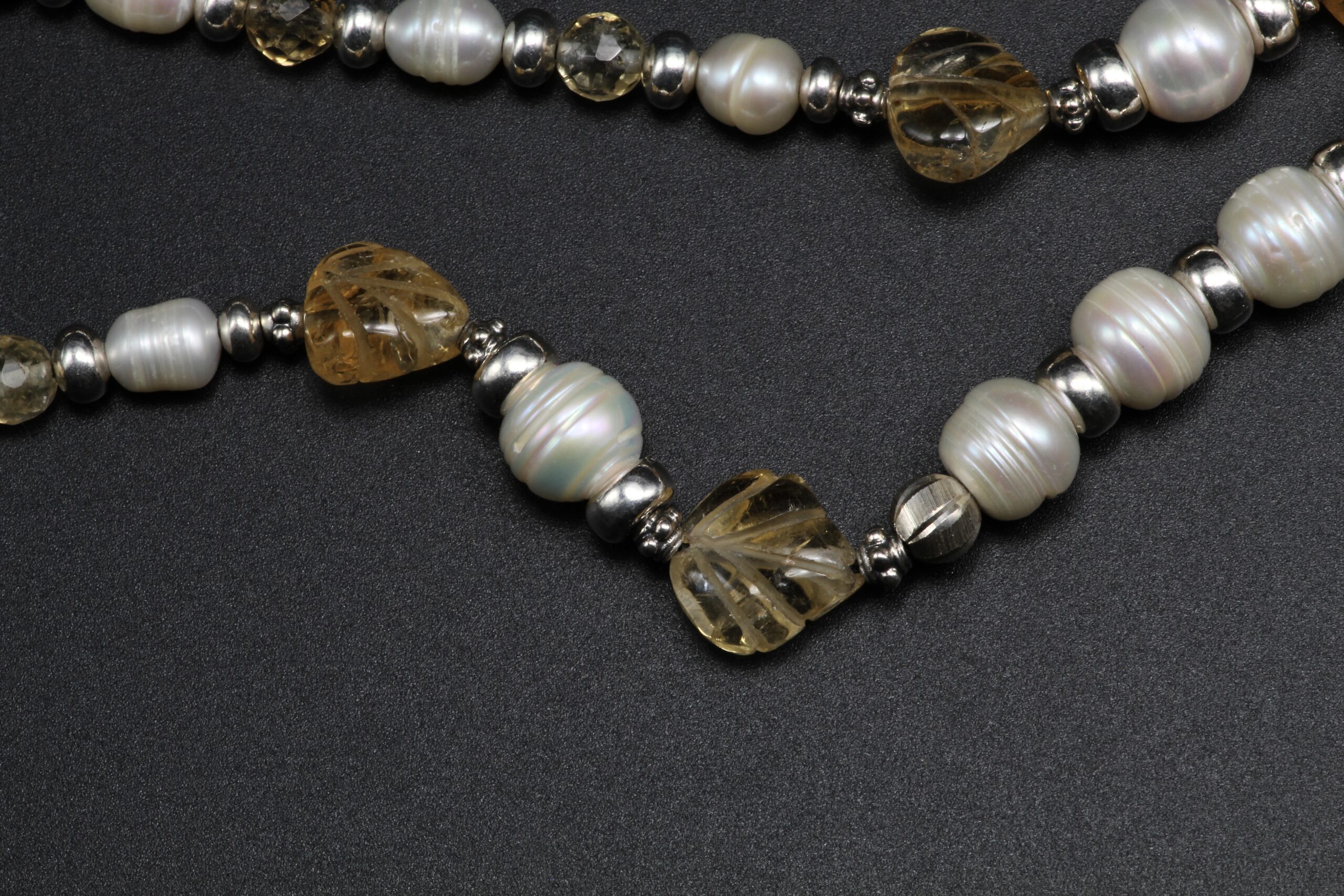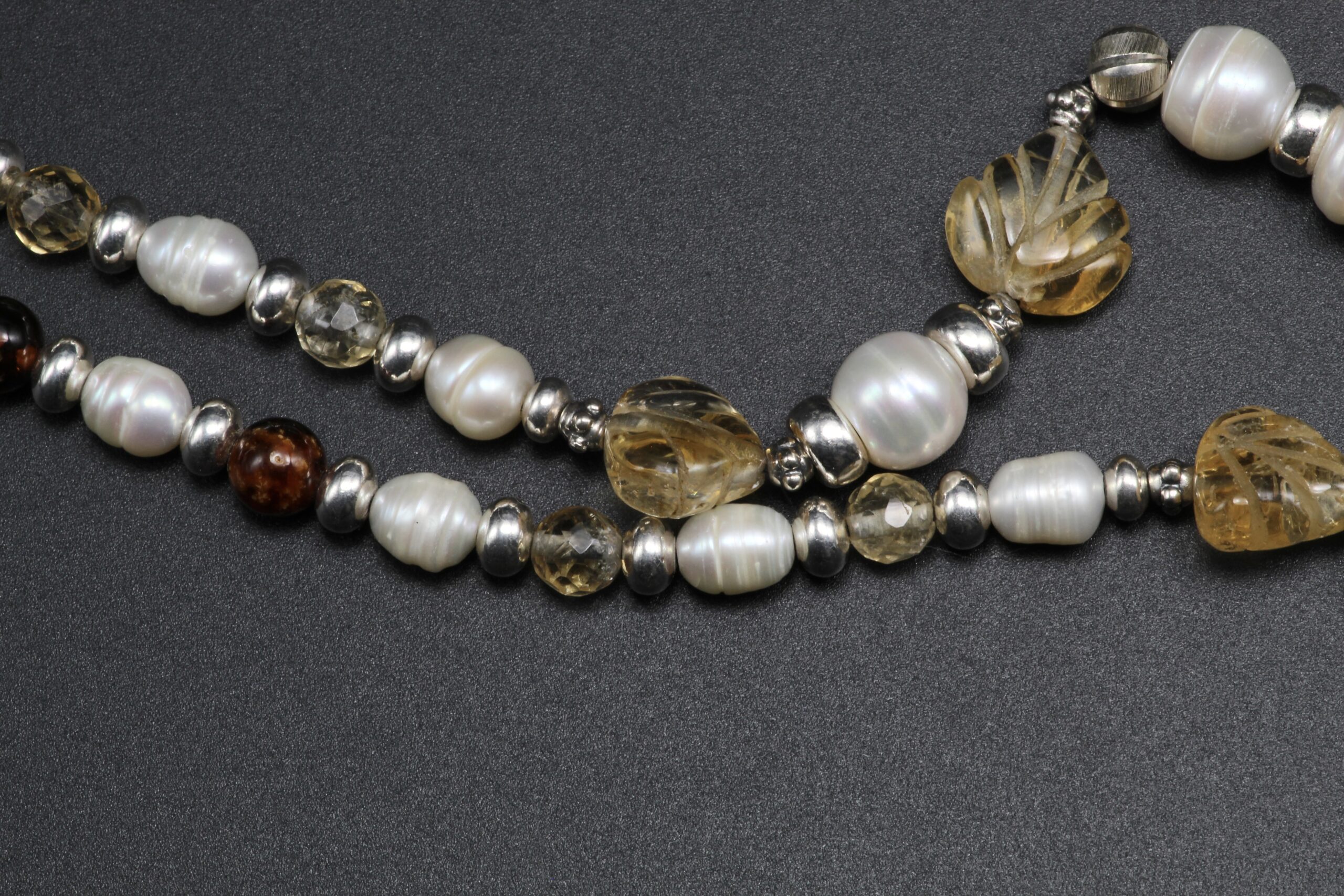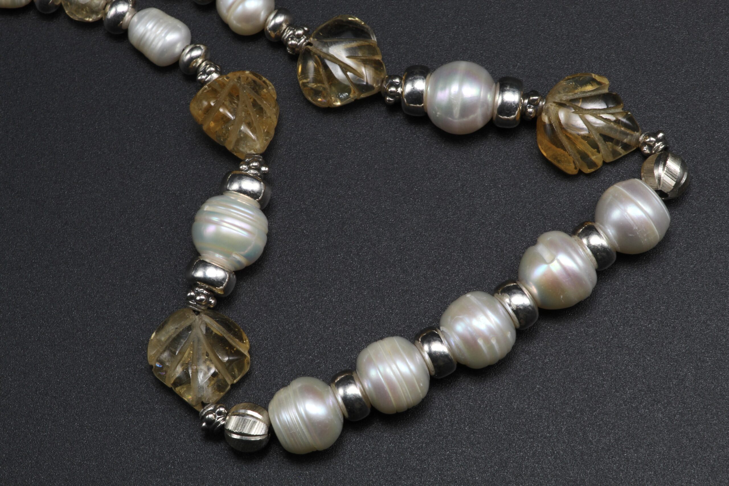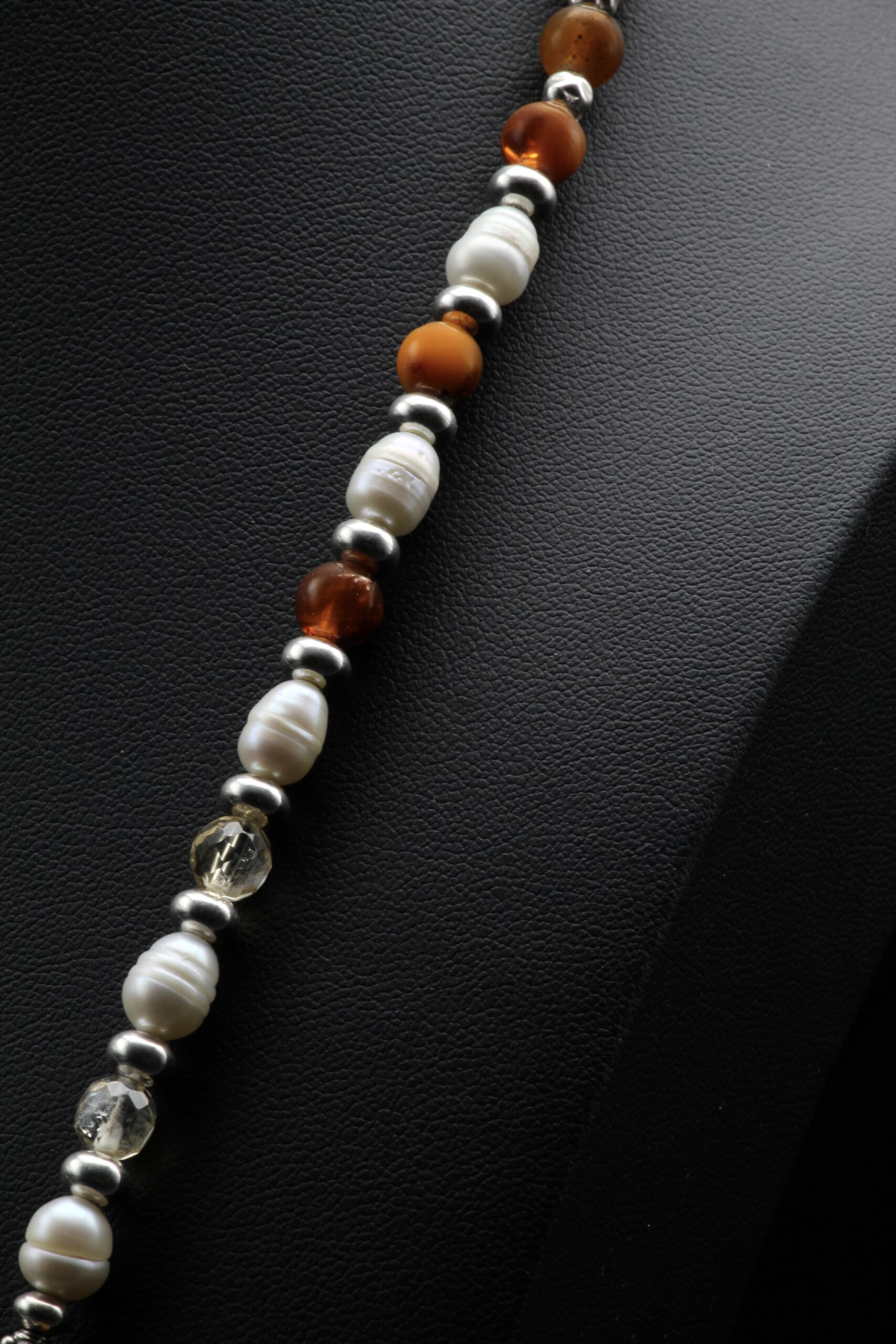 - האמבר בצבע דבש והפנינים משלבים בין טקסטורות שונות, מה שמעשיר את העיצוב ומקנה לו עומק.