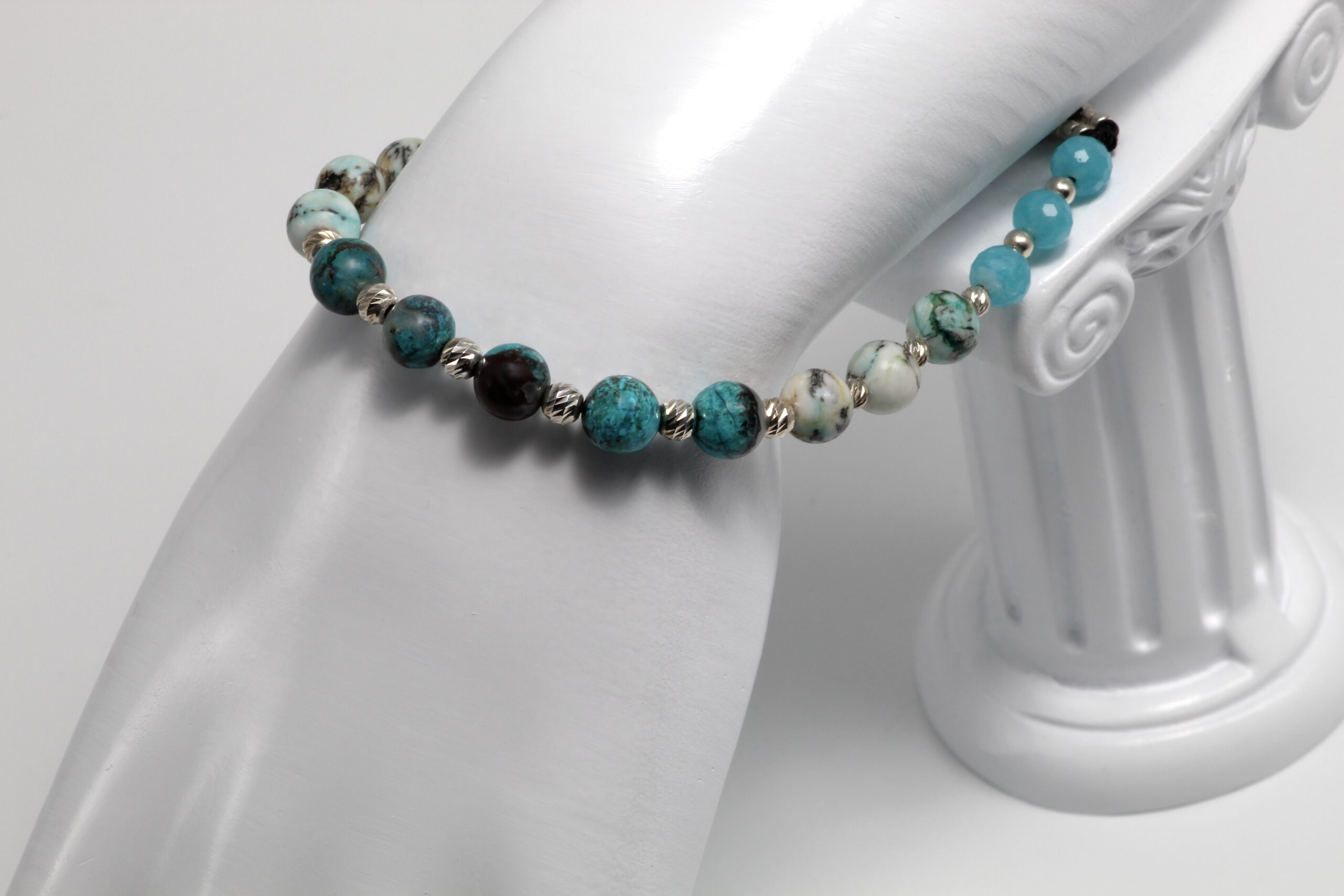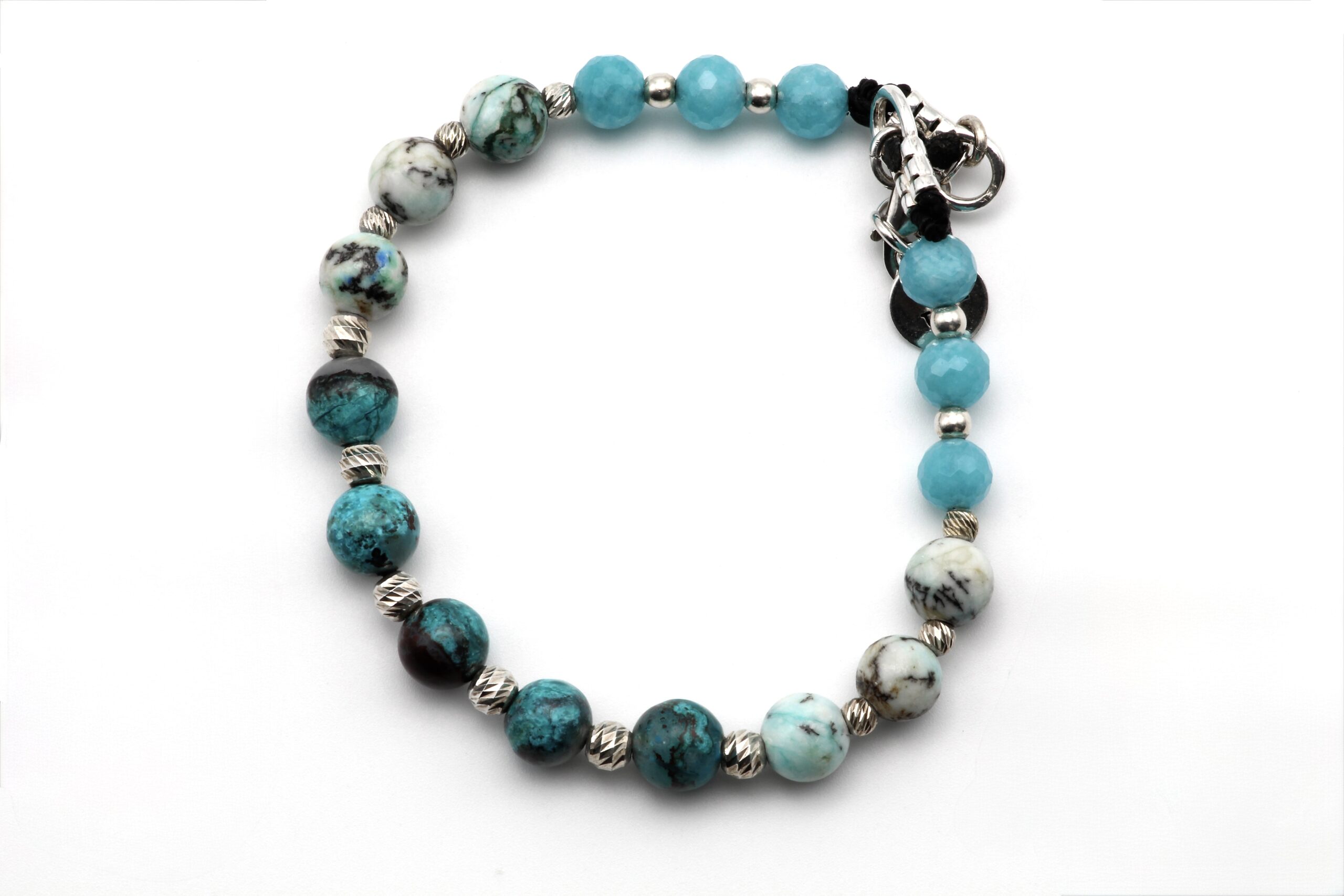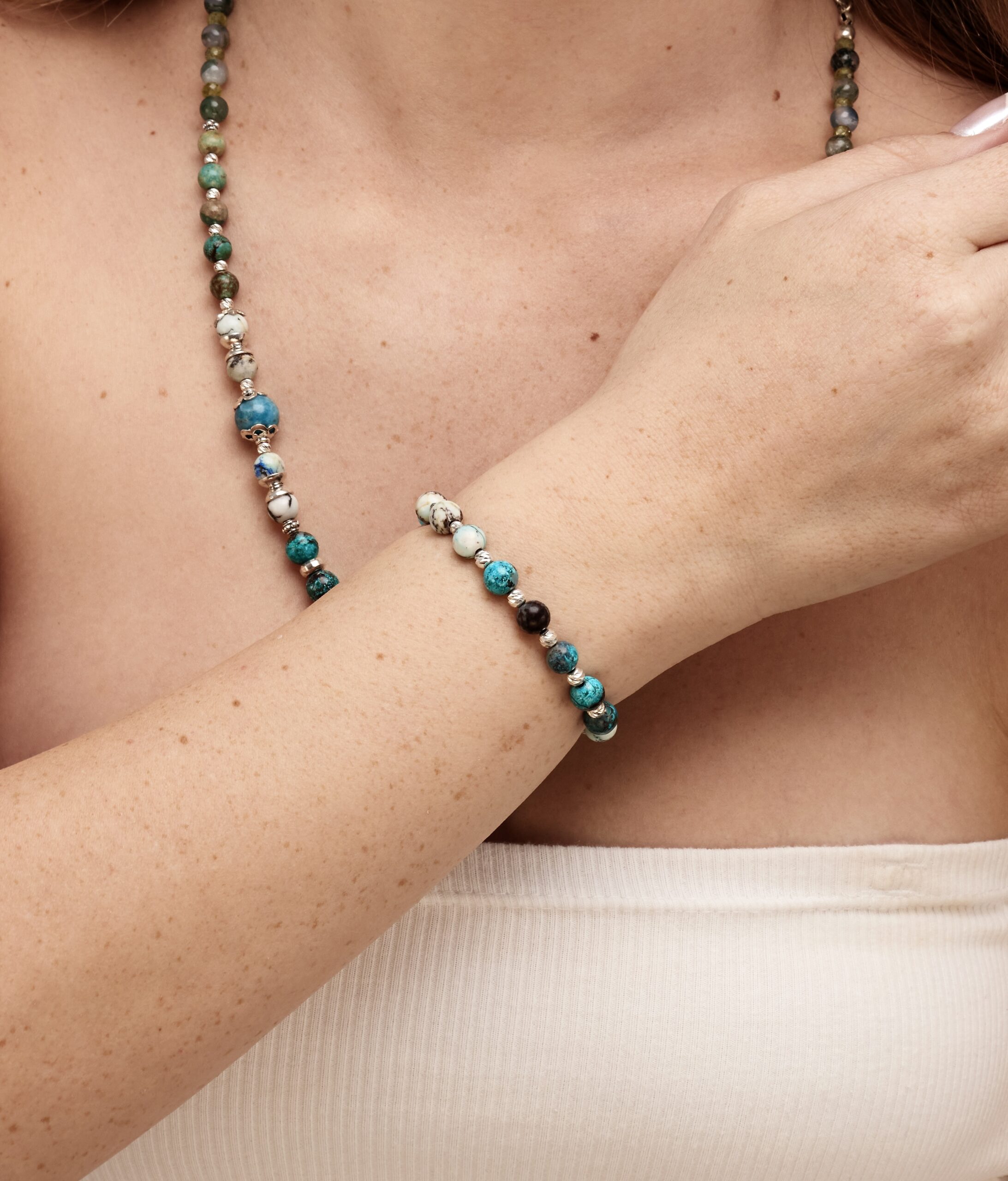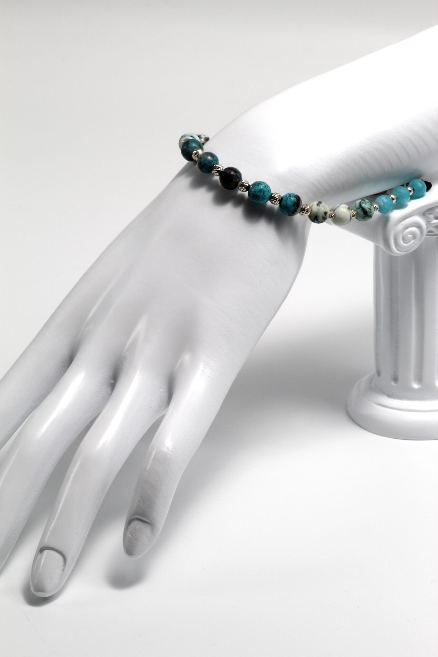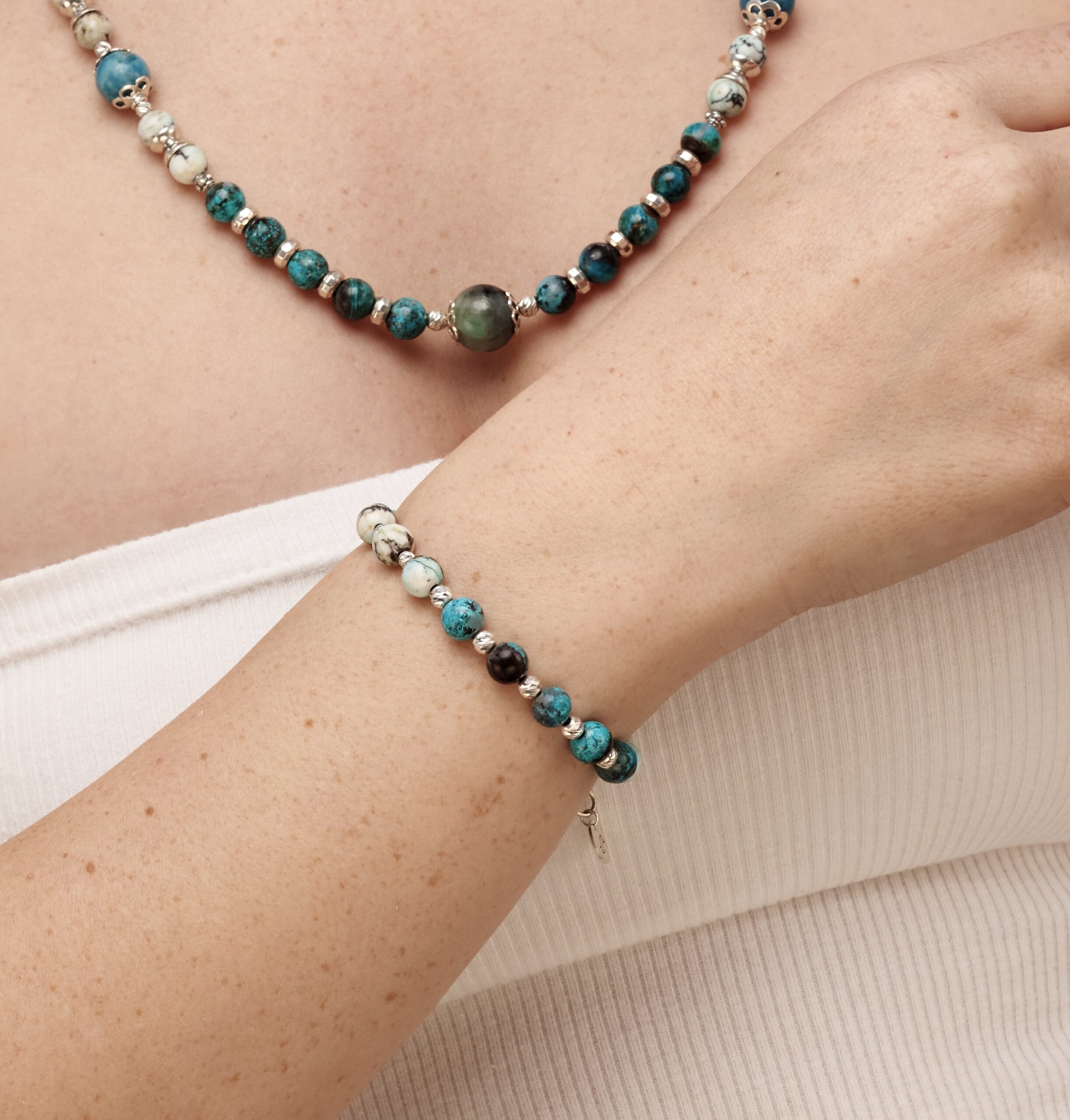 - הצמיד מעוצב עם אבני חן טבעיות מטופלות, המוסיפות צבעים מרהיבים ונעימים. האמזונייט מביא עימו תחושת רוגע, האזורייט מוסיף עושר ושפע, והקריסוקולה מעניקה אנרגיה חיובית ושקט פנימי.
