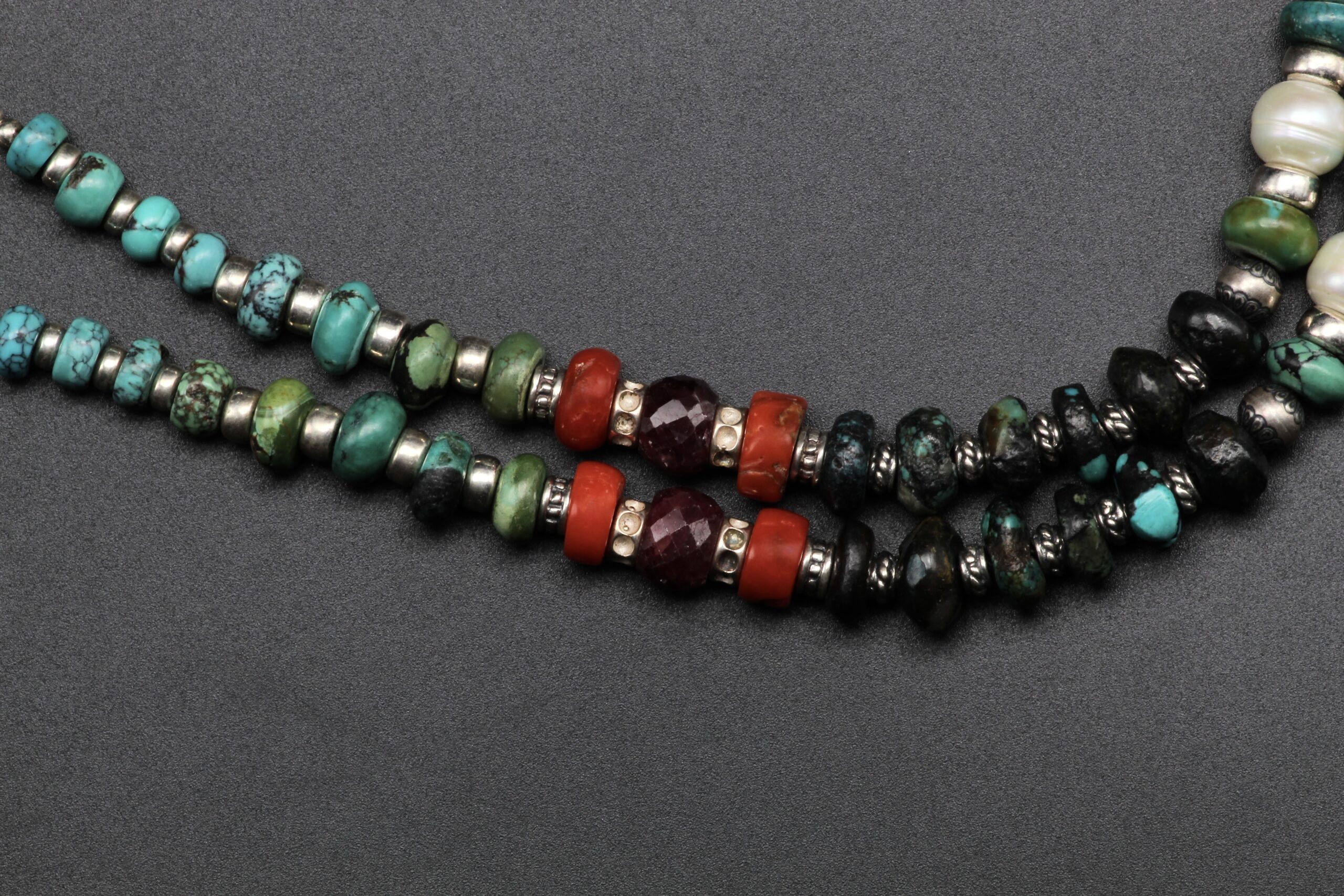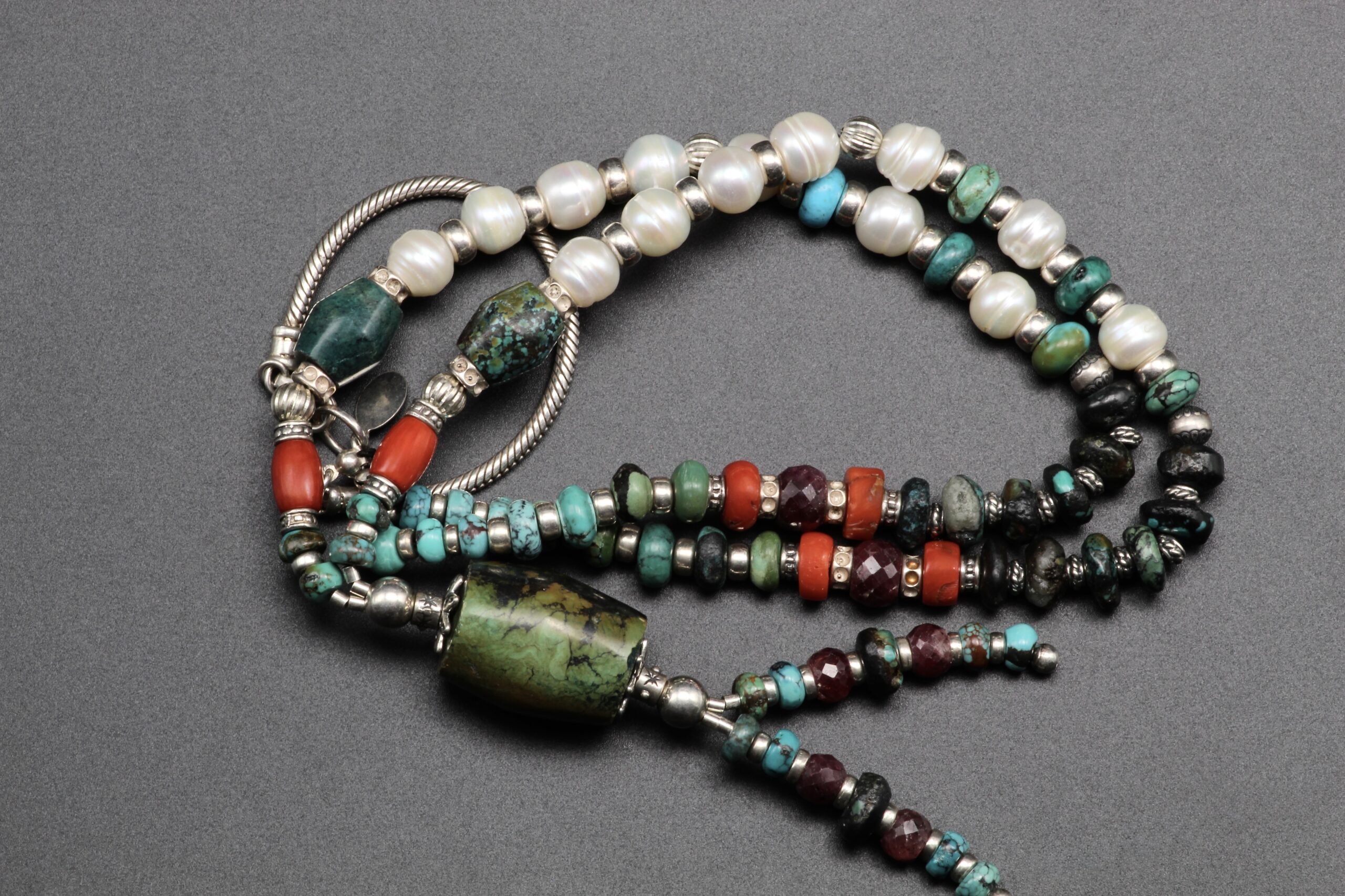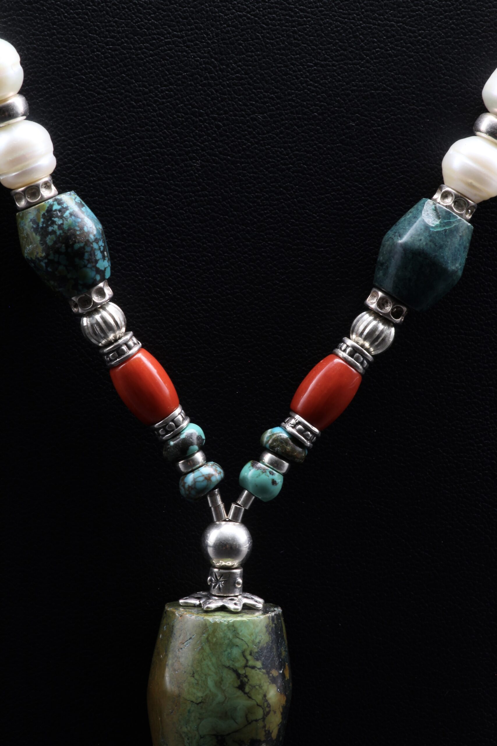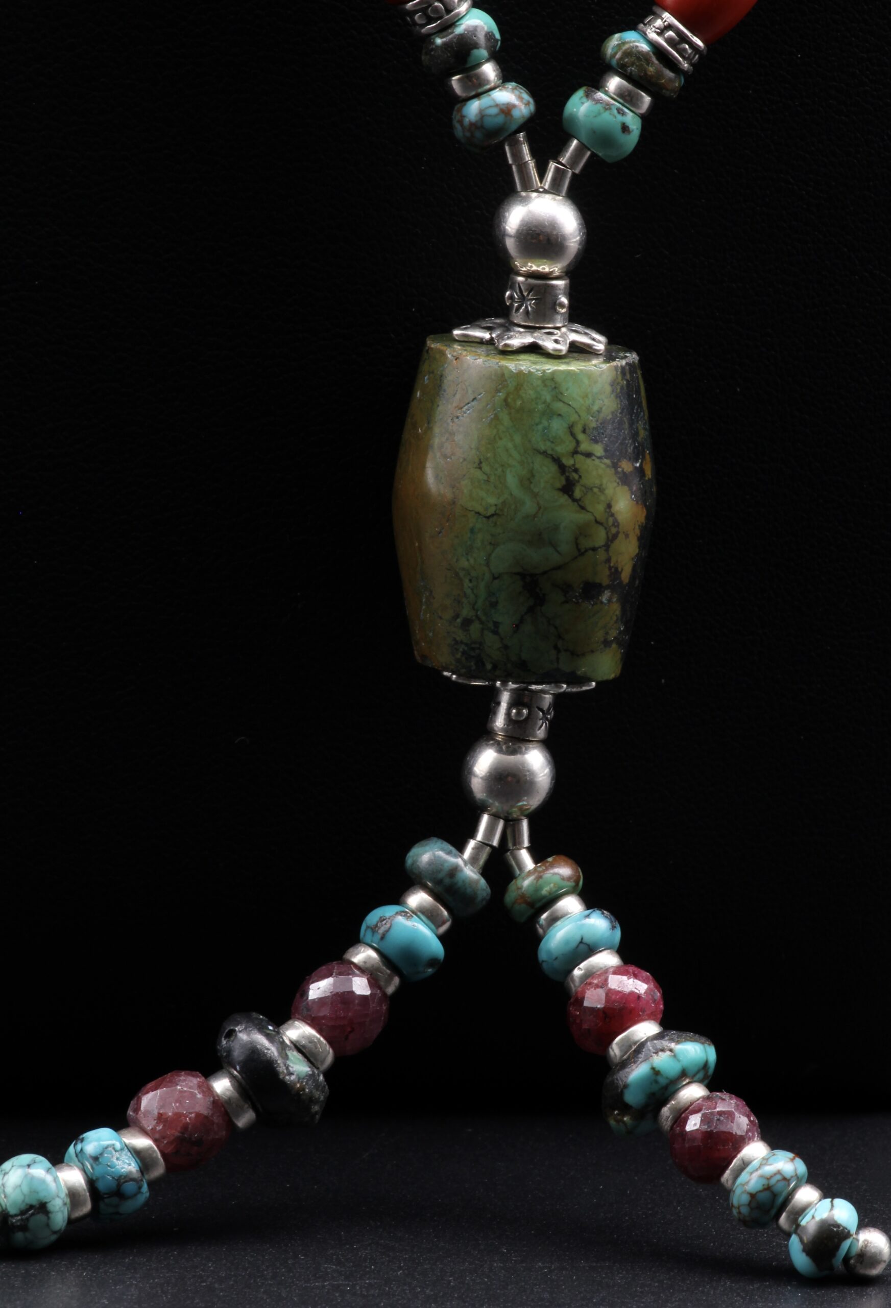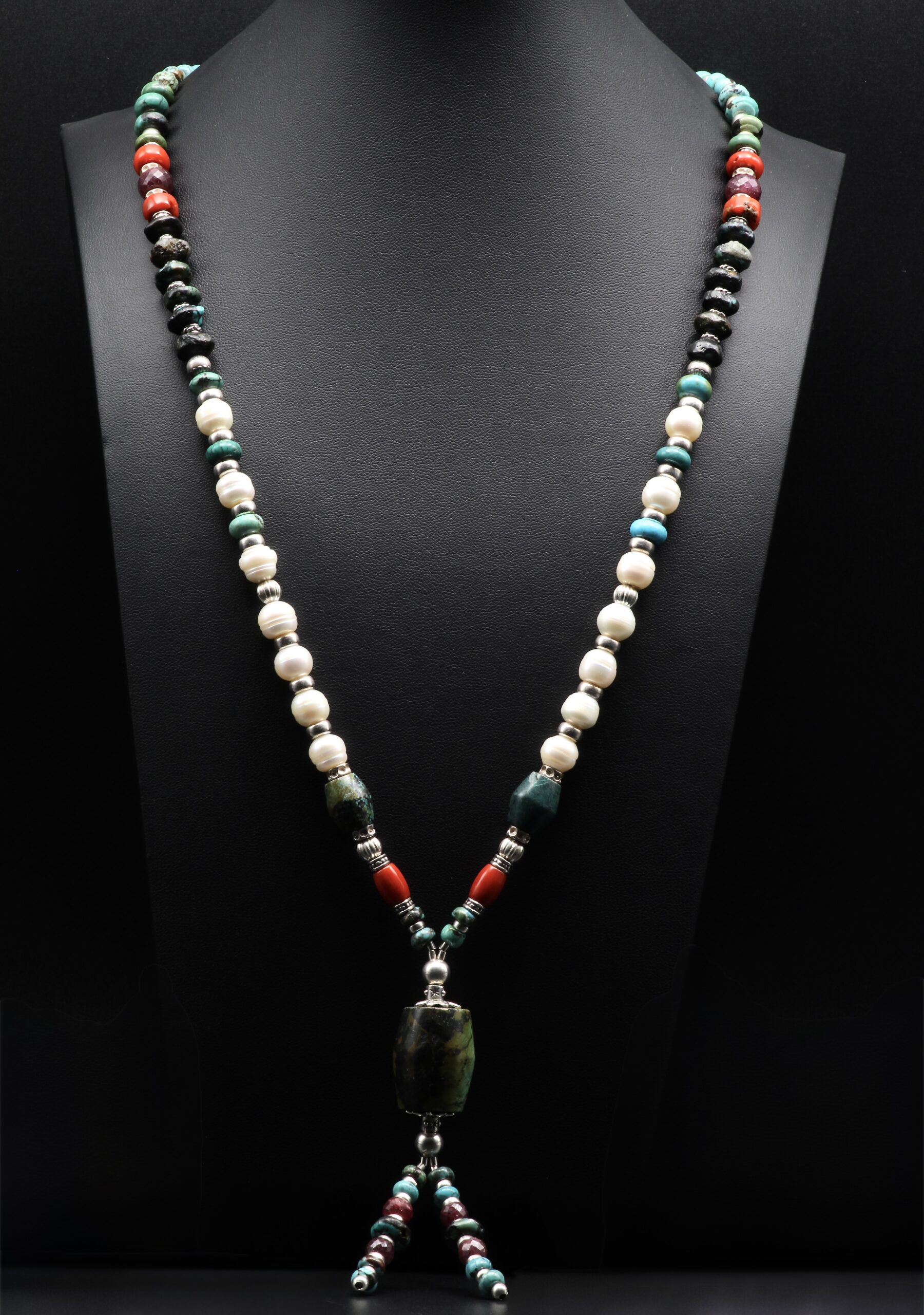 שילוב גוונים חיים של אדום (קורל ורובי), טורקיז וכחול יוצר ניגודים הרמוניים המקנים לתכשיט אופי בולט אך מאוזן.