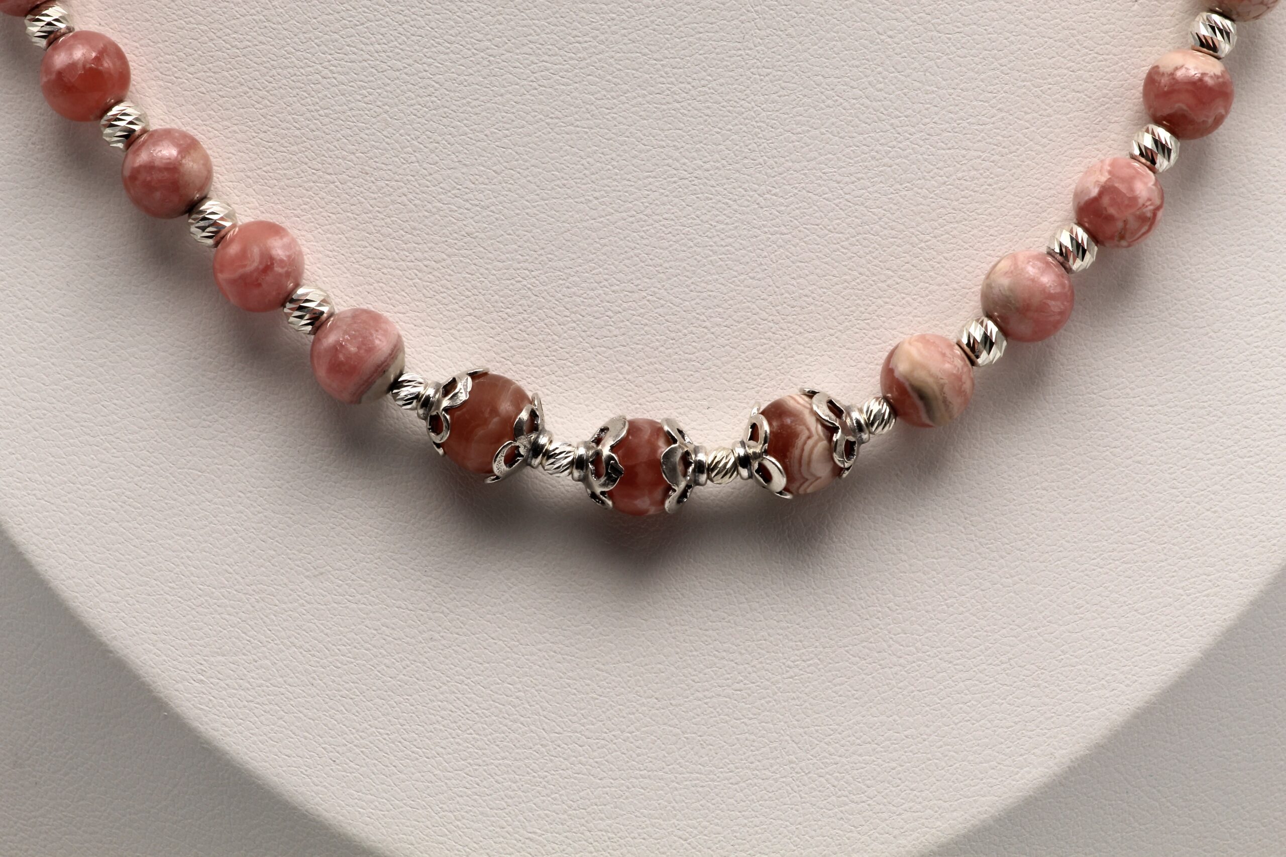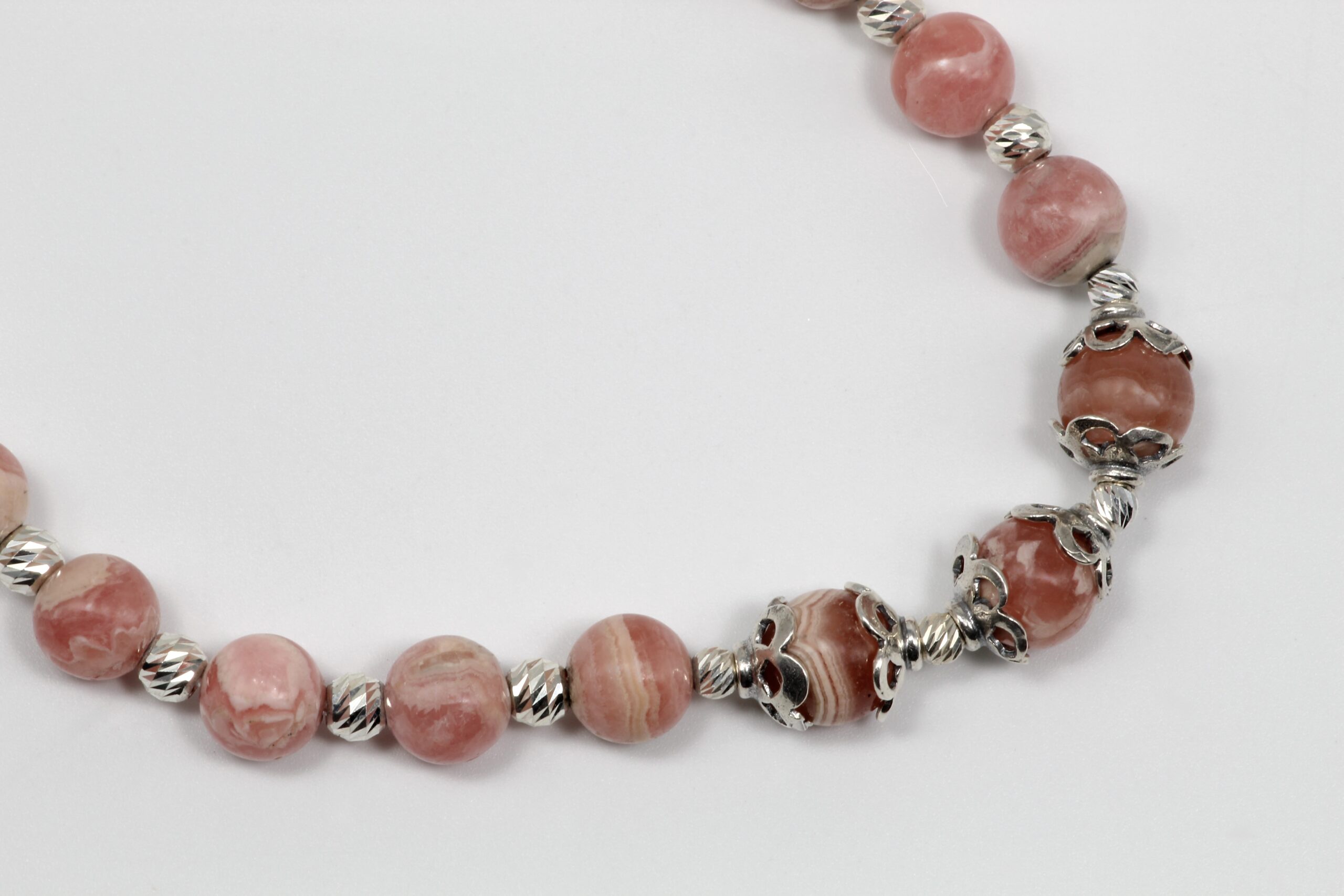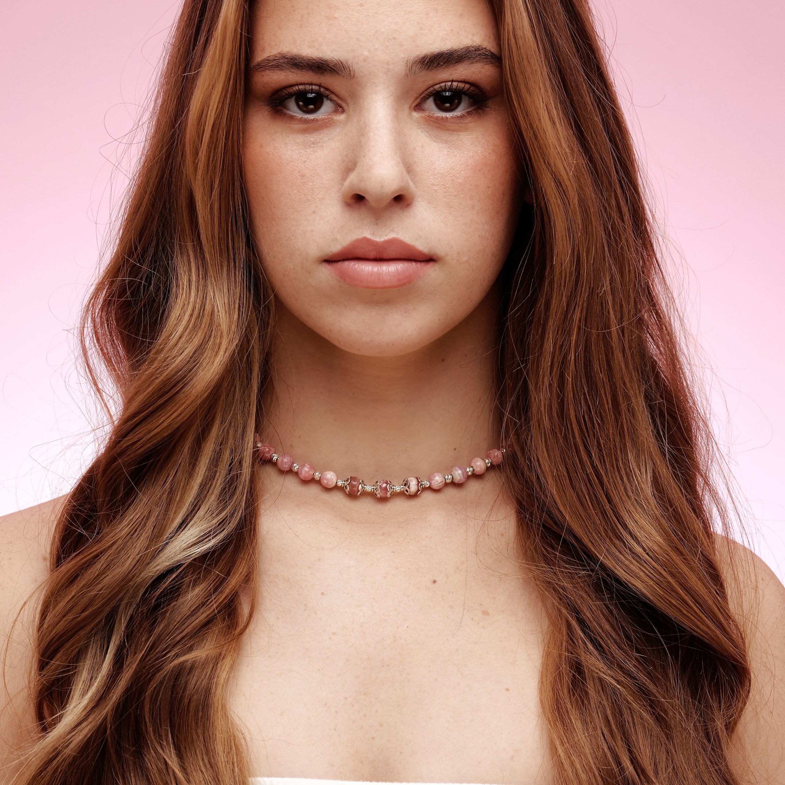 חרוזי ג’ייד ורוד מלוטשים מוסיפים עומק ומרקם חזותי עשיר.